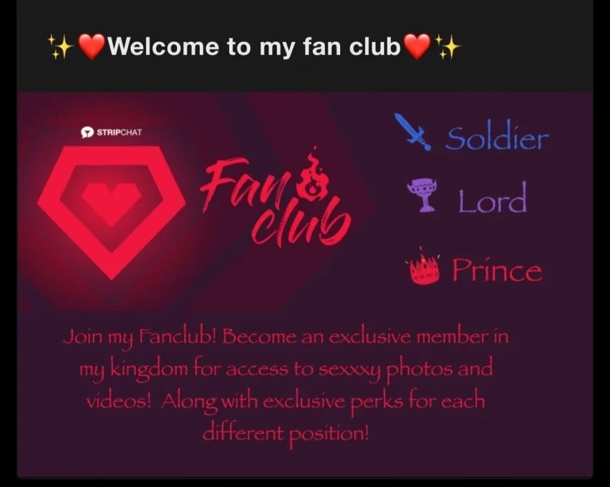 👑 Fan Club 👑 🔥 This is where I truly pamper you. 🔥 💋 If you're in my Club… you're one of the special ones. Those who join have access to my most intimate, playful, and energetic side. ✨ What you receive: • Exclusive content I don't share publicly • More personal photos and moments • Priority in my messages • Flirty surprises every week • Unique benefits only VIPs know about 🔥 This Club is for those who want to be close to me, those who enjoy my intense attitude and playful vibe. 💗 If you like my style… you'll fall in love here